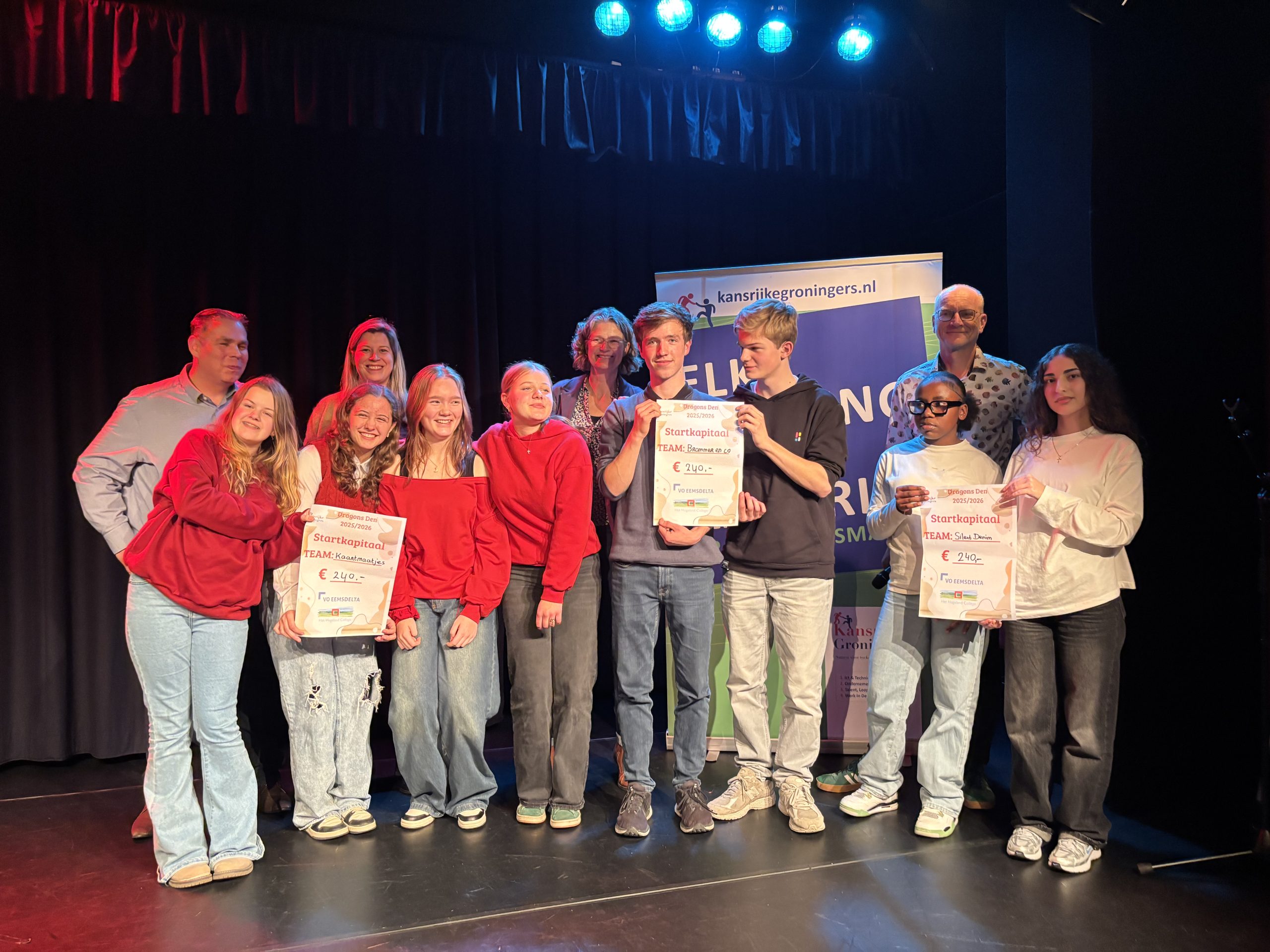 Het uiteindelijke doel is dat scholieren de kansen in de eigen regio pakken. Deze Dragons’ Den vond plaats op een bijzondere locatie: theater De Molenberg in Delfzijl. Sommige scholieren waren van tevoren echt zenuwachtig en hadden speciaal kleding aangeschaft of accessoires meegenomen om hun pitch kracht bij te zetten. De scholieren konden met hun pitch startkapitaal verdienen, per groepje variërend van 100 tot 240 euro per onderneming. Het budget van 1950,- euro aan startkapitaal was afkomstig van Kansrijke Groningers.